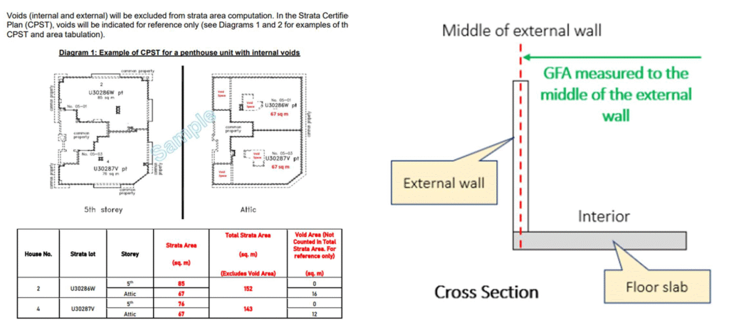 In addition, standardising the floor area to the middle of the wall was essential. Previously, various agencies had different definition. For example, URA’s GFA is measured to include the full thickness of external walls but excludes voids, whereas SLA’s strata area is only measured up to the middle of the wall and may include voids.